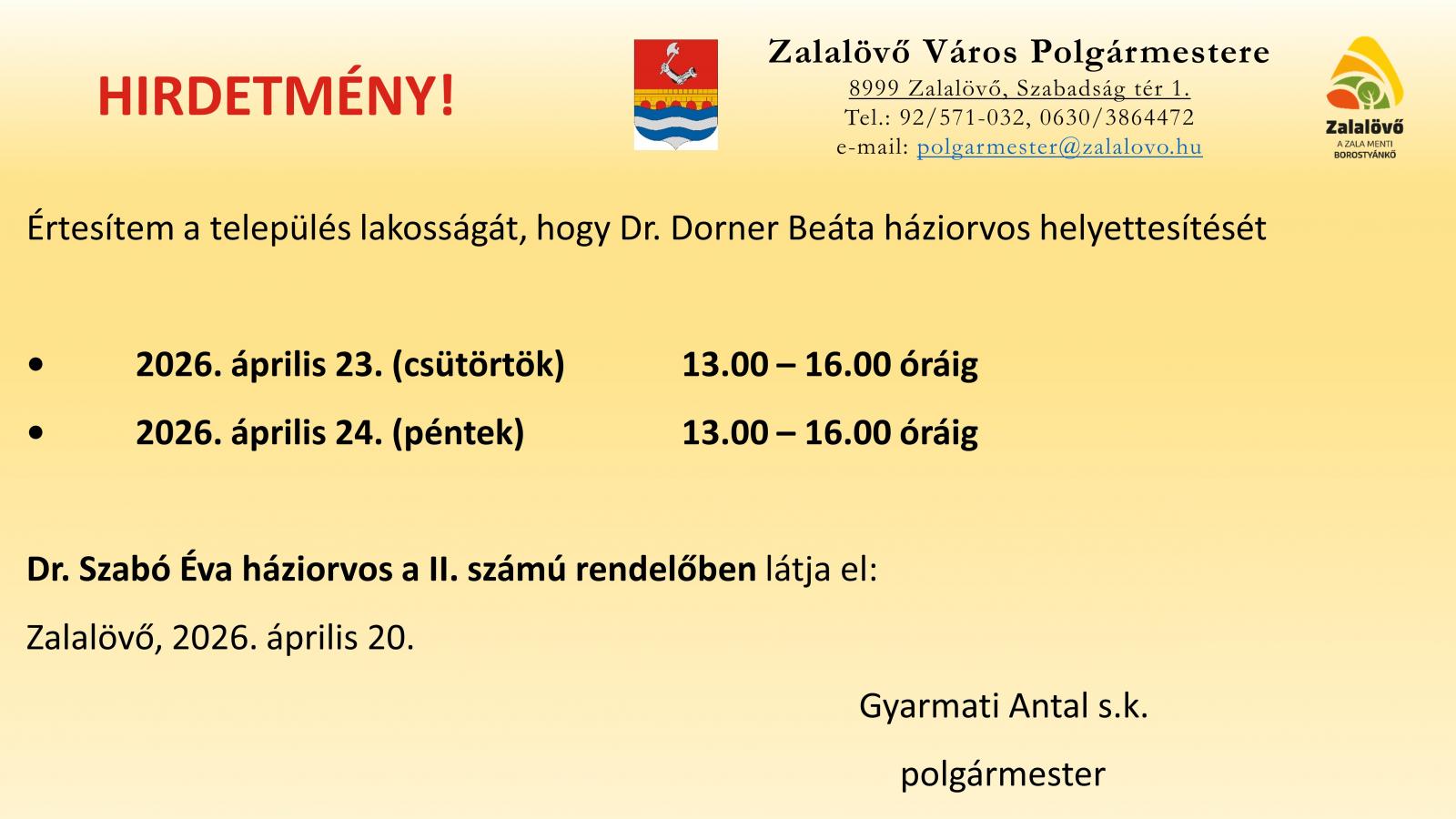Dr. Dorner Beáta háziorvos helyettesítése