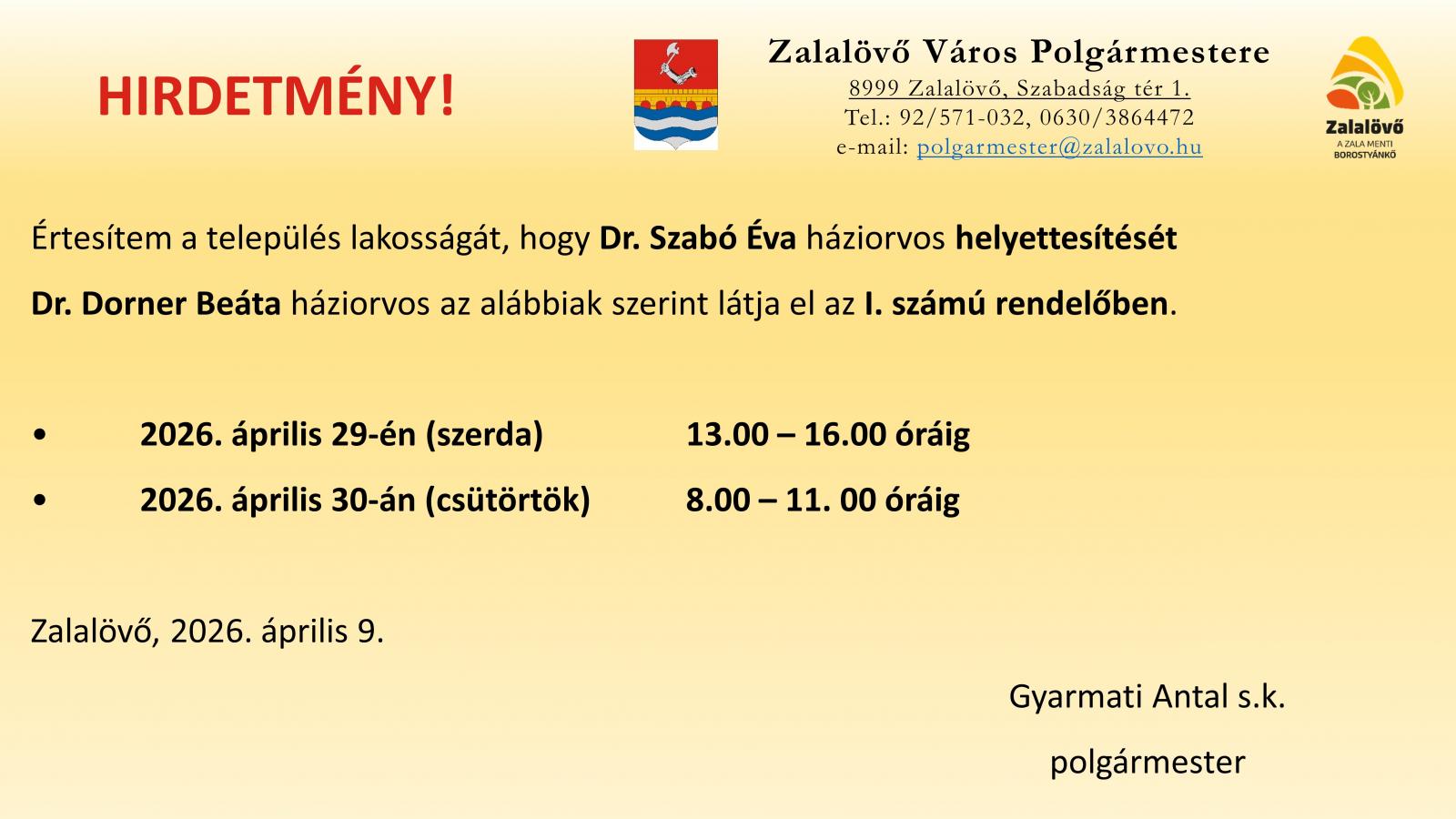 Dr. Szabó Éva háziorvos helyettesítése (2026.04.29-30)