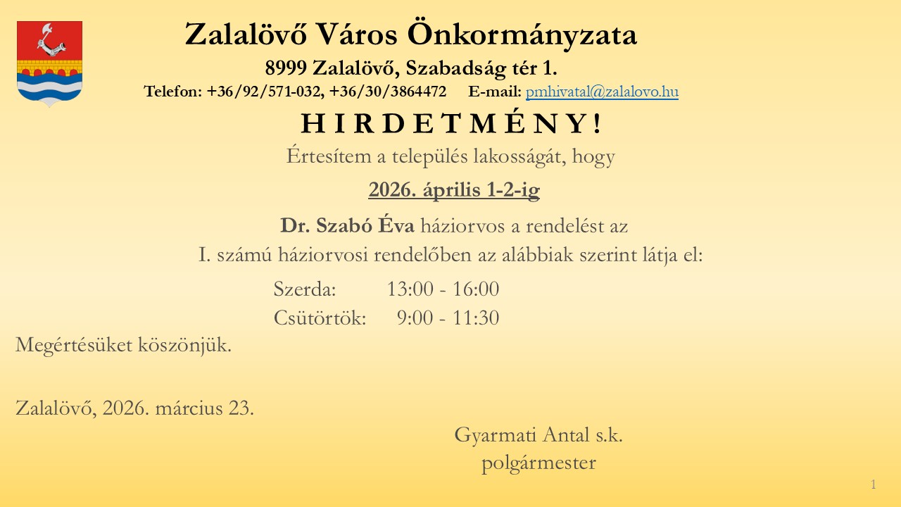 Dr. Szabó Éva háziorvos rendelése április 1-2-ig.