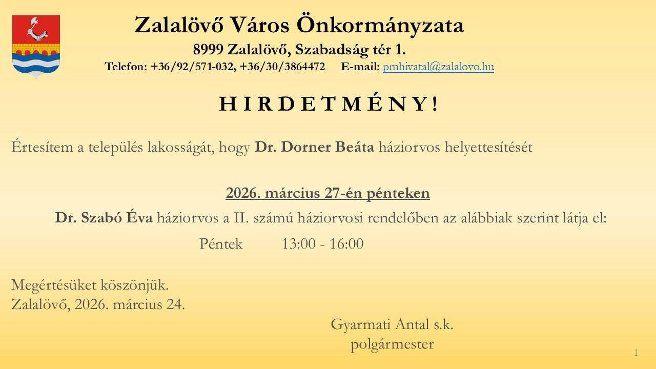 Dr. Dorner Beáta háziorvos helyettesítése 2026. március 27-én (péntek)