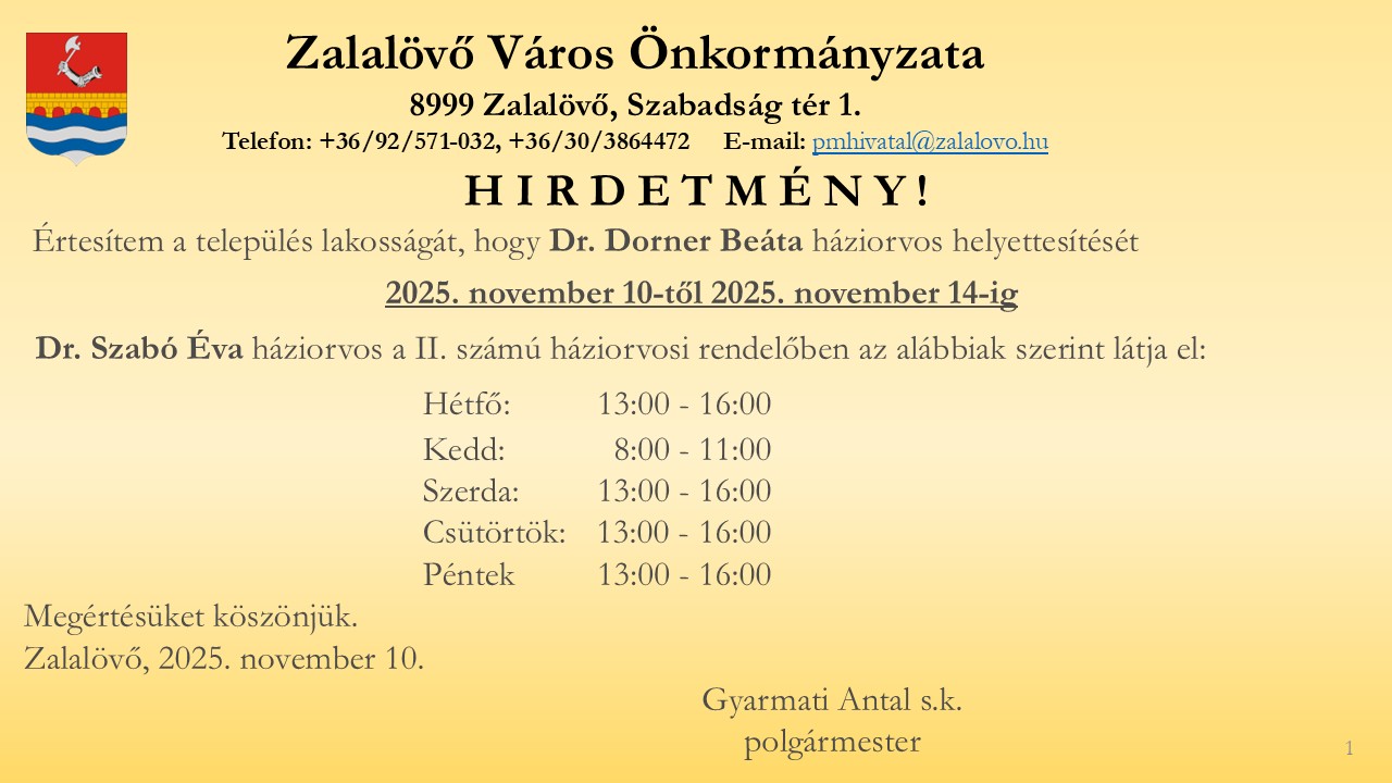 Hirdetmény - Dr. Dorner Beáta háziorvos helyettesítése 2025. november 10-14-én