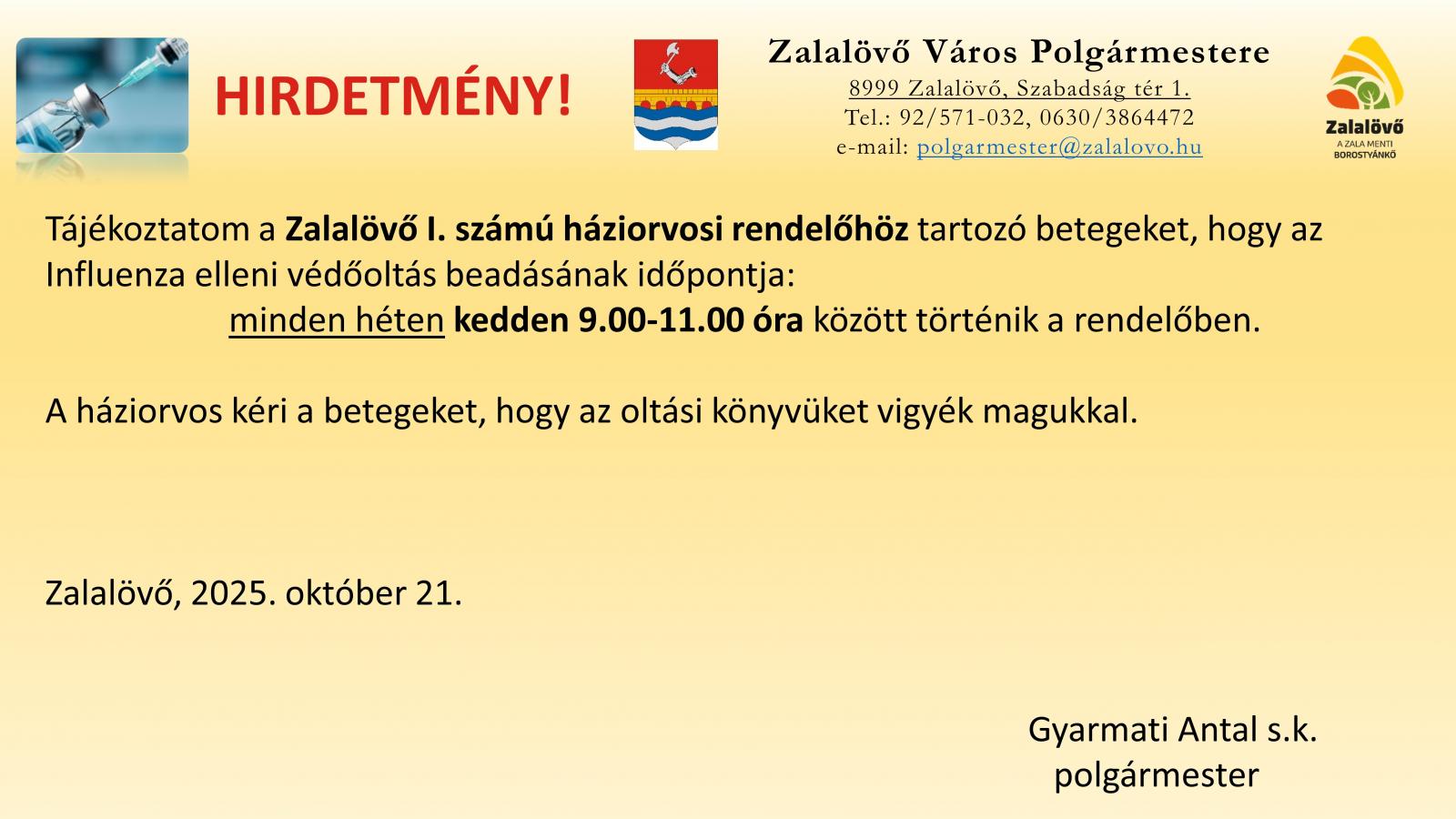 Influenza elleni védőoltás beadásának időpontja - Zalalövő I. számú háziorvosi rendelő