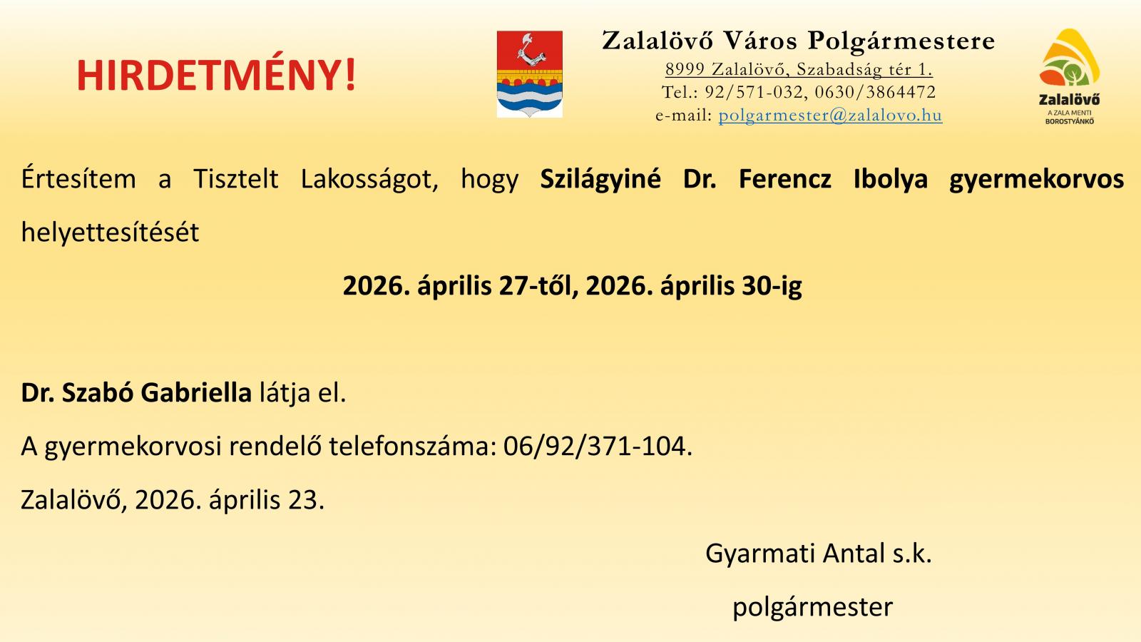 Szilágyiné Dr. Ferencz Ibolya gyermekorvos helyettesítése